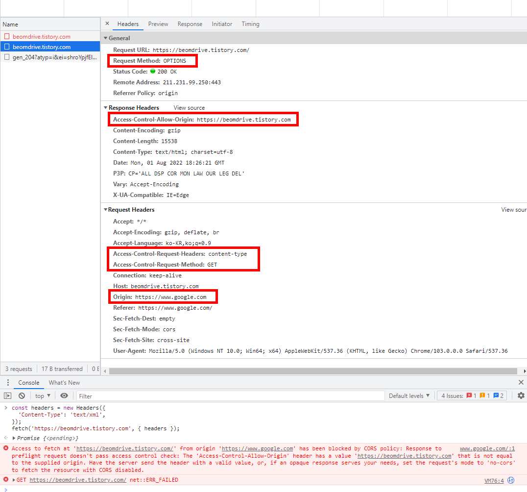 - 아래는 www.google.com 에서 제 블로그로 리소스 요청을 전송하였고, 브라우저가 자동으로 진행한 예비 요청(Preflight Request)의 예시입니다